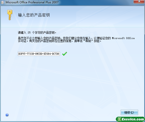 2、这时候会弹出一个安装office2007的窗口,我们在这里输入office2007下载页面的序列号,然后单击“继续”按钮。