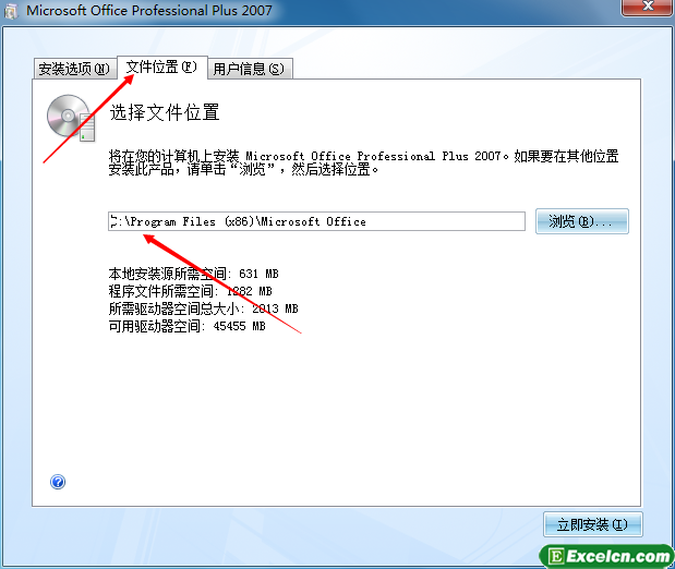 4、我们可以选择一下安装位置,我不建议大家把OFFICE2007装到C盘,大家最好把C改成D,然后单击“立即安装”按钮即可。