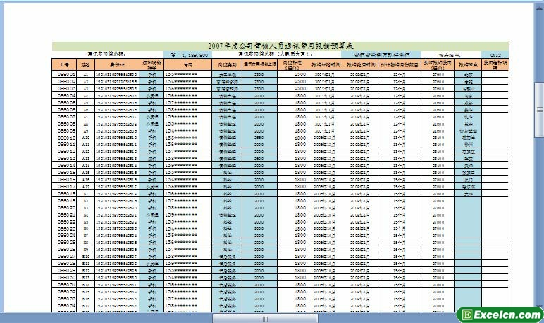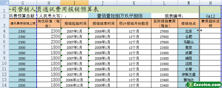 5、得到 2007 年度公司营销人员通讯费用报销预算表的打印预览效果,单元格区域 A1:N15将在一页上打印。