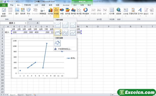 我们在做数据统计很分析的时候一般会使用excel来查看,比如我们可以查看全年的销售利润数据,或者是收入数据,我们通过数字查看会感觉非常普通,感觉excel表格里的数据不直观,看不到直观的变化,我们就可以通过在excel表格里插入折线图来观察全年的销售收入的增减变化,具体的操作步骤我们可以看图一,图一为我们讲解了在excel2010中插入折线图的整个说明步骤。