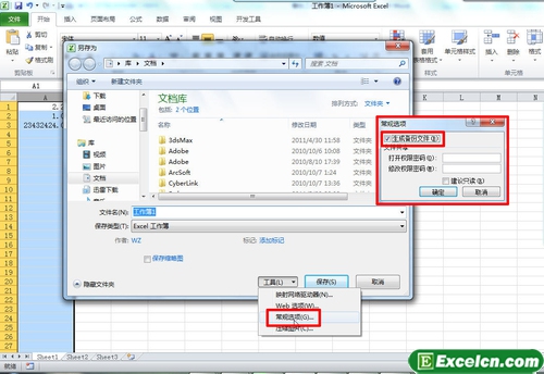 1、我们在excel2010中,单击文件标签中的另存为选项或者是【F12】键,然后在另存为的对话框中,我们选择保存按钮左侧的工具旁的下拉按钮。