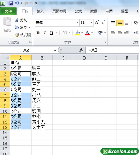 2、然后我们使用“CTRL+ENTER”的excel快捷键将列中的其他单元格填充内容,这个内容就是空白单元格上一个单位名称的单元格内容,最后我们还要把刚才输入的公式复制为数值,因为我们在制作excel数据透视表的时候是不可以有公式的。