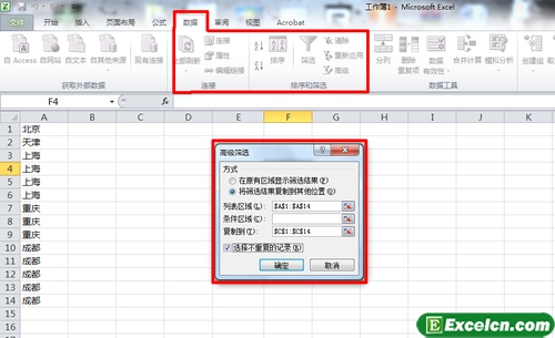 2、我们还可以选择不重复的记录,这样方便我们找到唯一的结果,我们单击去诶的那个以后,就会在用户选定的excel2010工作表区域中出现筛选的结果,我们可以把筛选的结果复制到其他的excel表格中。