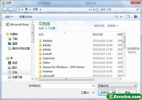 2、接下来就会打开一个打开对话框,我们可以看到在右上角有一个搜索栏,这个与windows7文件夹布局是一样的,我们在搜索栏输入excel文件的全名或者部分名称,这时候就开始搜索电脑中的excel2010工作簿了。