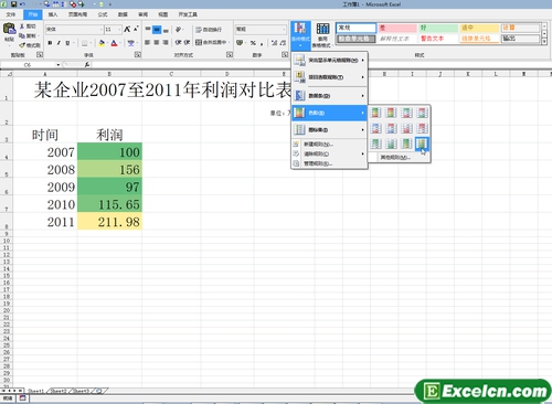 大家都知道excel2010的条件格式增强了很多,我们通过条件格式中的两种颜色刻度来设置,就可以查看数据的变化了,今天我们先来了解下excel2010中双色刻度的条件格式,我们举一个例子,比如要查看一个企业2007年到2011年的利润大小,那么我们可以用双色刻度的渐变来显示出来。