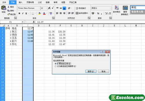 我们在排序的时候会遇见两种情况,如果我的工作表中只有一个数据列,那么点击排序图标之后,EXCEL2010会对此列立即排序。而如果我的工作表中有多列数据的话,EXCEL2010不会对选定的数据立即排序,而是弹出一个对话框,要求我确定排序依据,也就是我希望对单独一列排序还是以此列为中心其他列随当前列排序而变化。