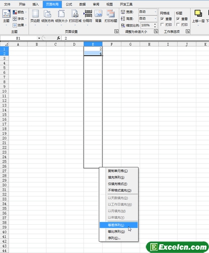 我先在第1、第2两个单元格中输入该数列的前两个数值比如说2和4。然后同时选中这两个单元格,把鼠标移至第2个单元格的右下角,当鼠标成细十字线状的时候,此时我们就可以按住右键向下拖,直到我想要的单元格,这个时候就可以松开右键,同时EXCEL2010会弹出一个菜单。