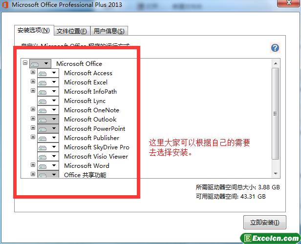 3、我们可以在红色方框里选择自己不需要安装的office2013组件,选择完毕以后,然后选择“文件位置”标签,来设置安装office2013的软件位置。