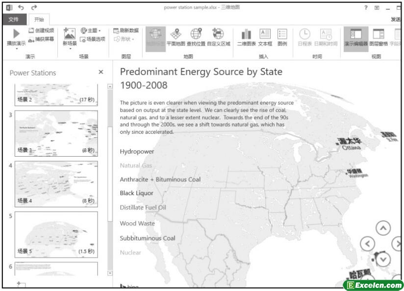 用户可以根据需求创建图表。Excel 2016增加了Power Map的插件,可以以三维地图的形式编辑和播放数据演示。也可以使用三维地图,绘制地理和临时数据的三维地球或自定义的映射,显示一段时间,并创建可以与其他人共享的直观漫游,如下图所示。