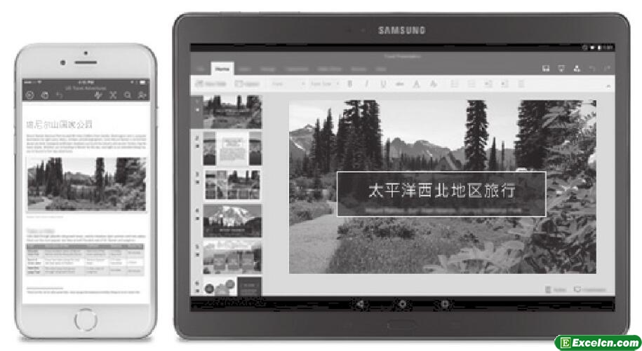 从Office 2013开始,微软公司就实现了电脑端与手机移动端的协作,用户可以随时随地实现移动办公。而在Office 2016中,微软公司强化了Office的跨平台应用,用户可以在很多电子设备上审阅、编辑、分析和演示Office 2016文档,如下图所示。