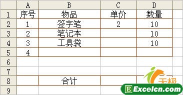 在这四列中任意一个单元格中输入数据(包括空格),此行(A→D列)各单元格将会自动添加框线。如图3。