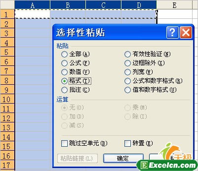 4、选择A1:D1区域,复制,选择A→D列,粘贴(如果A1:D1中已输入数据,可执行“编辑”→“选择性粘贴”→“格式”),这样就把第2步中设置的格式赋予了A→D列的所有单元格。如图2。