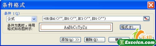 2、执行“格式”→“条件格式”,打开“条件格式”对话框。单击打开“条件1”下拉列表,单击选择“公式”,在随后的框中输入下面的公式“=OR($A1<>"",$B1<>"",$C1<>"",$D1<>"")”,意即只要A1、B1、C1或D1中有一个单元格内存在数据,将自动给这四个单元格添加外框线。
