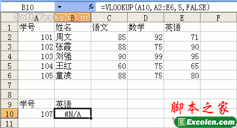 具体实例:在如图4所示的工作表中,我们希望通过在A10单元格中输入学号,来查找该名同学的英语成绩。B10单元格中的公式为 “=VLOOKUP(A10,A2:E6,5,FALSE)”,我们在A10中输入了学号“107”由于这个学号,由于在A2:A6中并没有和它匹配的值,因此出现了“#N/A”错误。