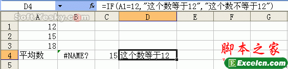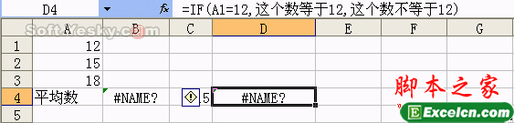 选中D4单元格,输入公式“=IF(A1=12,这个数等于12,这个数不等于12)”,回车后出现“#NAME?”错误(如12),原因是引用文本时没有添加引号。