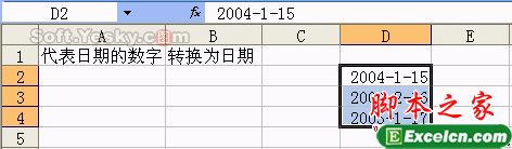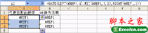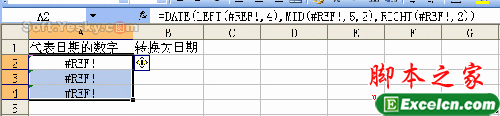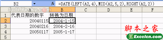 具体实例:如图19的工作表,我们利用公式将代表日期的数字转换为日期,在B2中输入了公式“=DATE(LEFT(A2,4),MID(A2,5,2),RIGHT(A2,2))”并复制到B4单元格。
