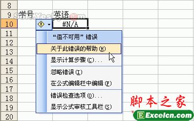 说明二:出现“#N/A”错误的原因还有其他一些,选中出现错误值的B10单元格后,会出现一个智能标记,单击这个标记,在弹出的菜单中选择“关于此错误的帮助”(如图6),就会得到这个错误的详细分析(如图7),通过这些原因和解决方法建议,我们就可以逐步去修正错误,这对其他的错误也适用。