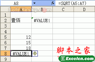 图16中,在A8输入公式“=SQRT(A5:A7)”,对于函数SQRT,它的参数必须为单一的参数,不能为区域,因此出错。改正方法为修改参数为单一的参数即可。