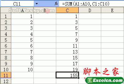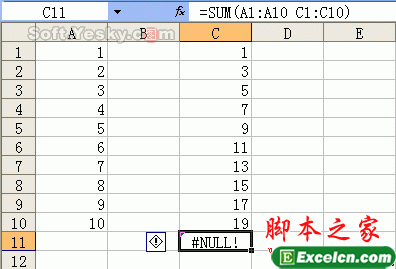 具体实例:如图23所示的工作表中,如果希望对A1:A10和C1:C10单元格区域求和,在C11单元格中输入公式“=SUM(A1:A10 C1:C10)”,回车后出现了“#NULL!”错误,这是因为公式中引用了不相交的两个区域,应该使用联合运算符,即逗号 (,)。