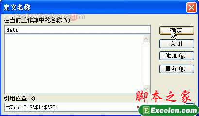 改正的方法为:选中“A1:A3”单元格区域,再选择菜单“名称→定义”命令,打开“定义名称”对话框,在文本框中输入名称“data”单击“确定”按钮(如图10)。