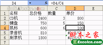 具体实例:如图1的所示的工作表,我们利用公式根据总价格和数量计算单价,在D2单元格中输入的公式为“=B2/C2”,把公式复制到D6单元格后,可以看到在D4、D5和D6单元格中返回了“#DIV/0!”错误值,原因是它们的除数为零或是空白单元格。