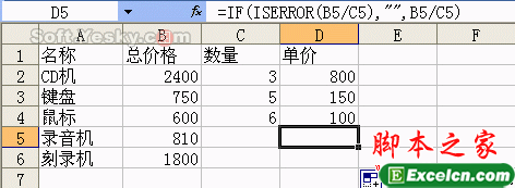 假设我们暂时不知道“录音机”和“刻录机”的数量,又不希望D5、D6单元格中显示错误值,这时可以用IF函数进行控制。在D2单元格中输入公式 “=IF(ISERROR(B2/C2),"",B2/C2)”,并复制到D6单元格。可以看到,D5和D6的错误值消失了,这是因为IF函数起了作用。整个公式的含义为:如果B2/C2返回错误的值,则返回一个空字符串,否则显示计算结果。