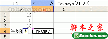 具体实例:如图8所示的工作表,我们想求出A1:A3区域的平均数,在B4单元格输入的公式为“=aveage(A1:A3)”,回车后出现了 “#NAME?”错误(如图8),这是因为函数“average”错误地拼写成了“aveage”,Excel无法识别,因此出错。把函数名称拼写正确即可修正错误。