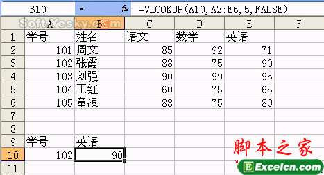 如果要修正这个错误,则可以在A10单元格中输入一个A2:A6中存在的学号,如“102”,这时错误值就不见了(如图5)。