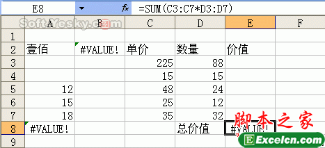 如图17的工作表,如果要想用数组公式直接求出总价值,可以在E8单元格中输入公式“{=SUM(C3:C7*D3:D7)}”,注意其中的花 括号不是手工输入的,而是当输入完成后按下Ctrl+Shift+Enter键后,Excel自动添加的。如果输入后直接用Enter键确定,则会出现 “#VALUE”错误。