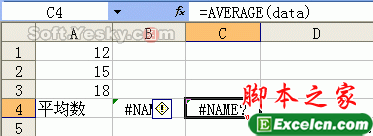 选中C4单元格,输入公式“=AVERAGE(data)”,回车后也出现了“#NAME?”错误(如图9)。这是因为在这个公式中,我们使用了区域名称data,但是这个名称还没有被定义,所以出错。