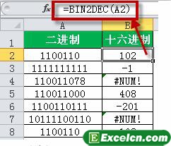 以下面这个二进制转十六进制的excel截图来介绍:B2输入公式,=BIN2DEC(A2),下拉完成转换。