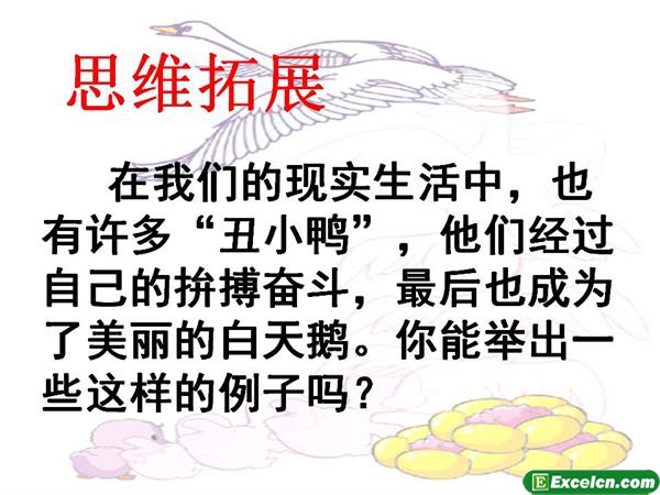 大家看到的PPT模板人教版七年级语文下册第3课《丑小鸭》PPT课件是由excel学习网为您提供的,该PPT模板的后缀名为.ppt,此PPT模板是人教版七年级语文下册第3课《丑小鸭》PPT课件,各位老师可以通过本站免费下载此ppt课件,在本站可以免费下载使用,您还可以使用PPT对该模板进行修改和设置成为自己所需的样式。