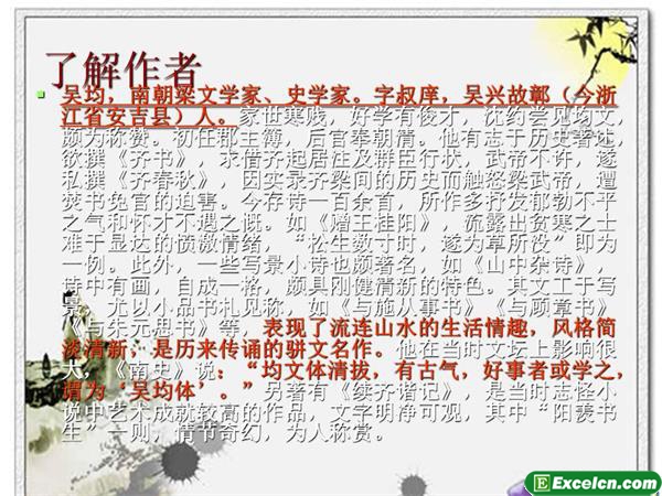 大家看到的PPT模板人教版八年级语文下册第21课《与朱元思书》ppt课件是由excel学习网为您提供的,该PPT模板的后缀名为.ppt,这个ppt模板是人教版八年级语文下册第21课《与朱元思书》ppt课件,用于多媒体课程使用,在本站可以免费下载使用,您还可以使用PPT对该模板进行修改和设置成为自己所需的样式。