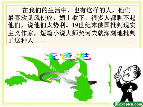 通过下载人教版九年级语文下册第7课《变色龙》ppt课件模板您就不必再自己制作了,这样可以大大的提高您的工作效率,为您节省时间,同时您也可以借鉴该模板的样式来制作自己所需的模板。
