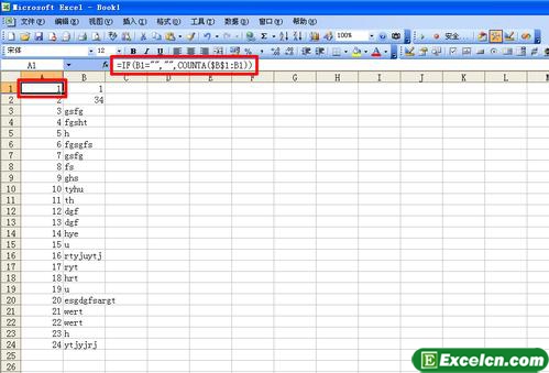 2、比如我们选中A1单元格,我们在该单元格输入函数式为:“=IF(B1=””,””,COUNTA($B$1:B1)) ”(引号中黑体的部分),然后向下拖拽,填充A列,这样我们只要在B列单元格输入内容,A列就会自动输入序号了。