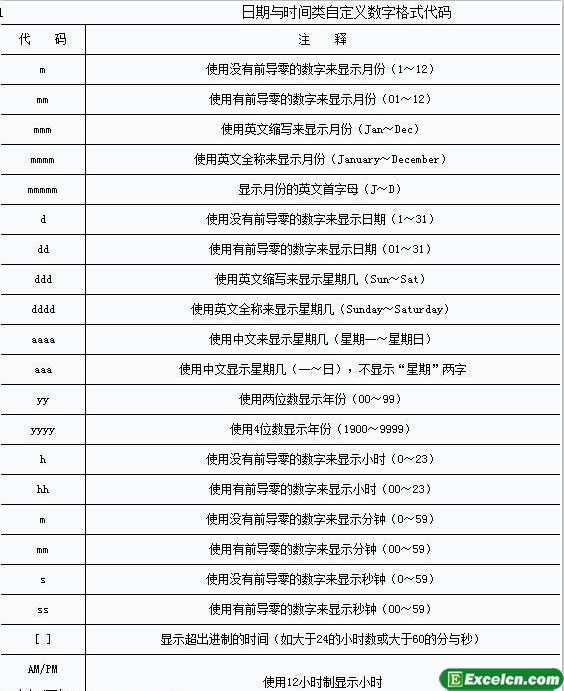 用户还可以自定义日期与时间类的数字格式,只是格式代码会简单很多。图1介绍了用于定义日期与时间的代码,大家可以根据图2中的时间格式代码来自定义数字格式。