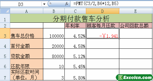 5、单元格 D3 中得到年利率为 4.52%时顾客每月还款额为 1941 元,也可以直接在单元格 D3 中输入公式=PMT(C3/2,B6*12,B5),按下 Enter 键后得到结果。