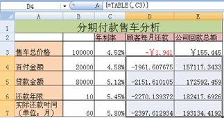 单变量模拟运算主要用来分析当其他因素不变时, 一个参数的变化对目标值的影响。假设某企业推出 10 万元汽车,顾客可以使用分期付款方式支付,要求首付为 20000,年限为 10 年,目前的年利率为 4.52%,分月偿还。 则利用函数可以计算出每月的偿还额, 然后建立单变量模拟运算表,快速求出不同年利率情况下客户需要支付的金额和公司的回款总额。