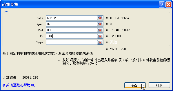 Fv 表示未来值,或在最后一次付款后希望得到的现金余额,如果省略 Fv,则假设其值为零,也就是一笔贷款的未来值为零。