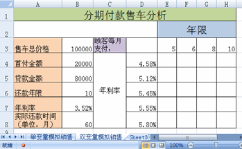 7、在单元格区域E4:H8 中显示出将年利率和年限都作为变量时顾客每月应支付的金额。