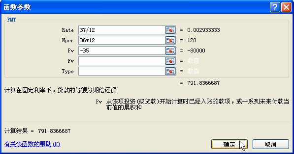 4、单击【确定】按钮,也可以直接向单元格 D3 中输入公式=PMT(B7/12,B6*12, B5),按下 Enter 键得到结果。