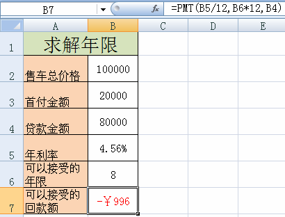 7、在“单变量求年限”工作表的单元格B6中得到当顾客每个月偿还金额为 1200 时, 可以接受的年限约为 6.4 年。