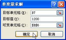 4、弹出【单变量求解】对话框,单元格的地址B7 被自动添加到 【目标单元格】 文本框中; 在 【目标值】 文本框中输入预定的目标数值 1200; 在 【可变单元格】文本框中输入单元格地址$B$6,也可以通过单击【可变单元格】文本框右侧的折叠按钮添加单元格地址$B$6,单击【确定】按钮。