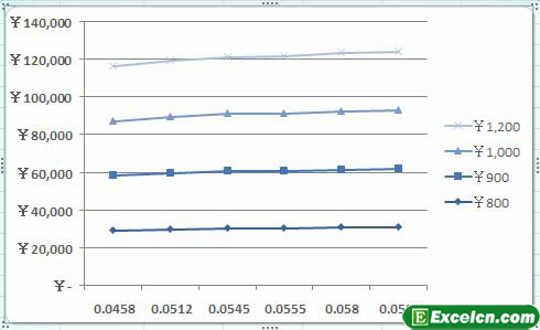 如果需要更加直观地查看和比较数据,还可以将计算结果转换为图表,下面就将双变量模拟运算表转换为图表, 将模拟运算表转换为图表操作方法如下: