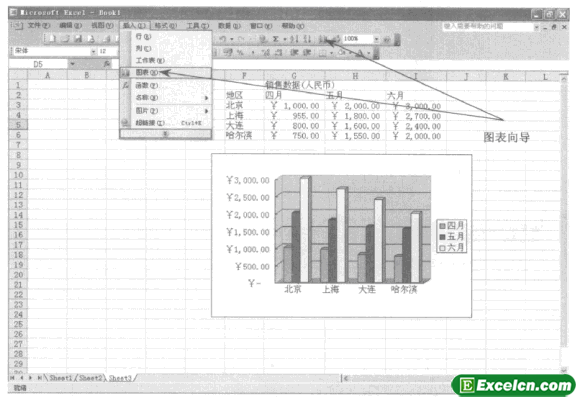 Excel为我们提供了70种不同类型的图表,如果你有最基本的数据,就可以充分利用Excel强大的图表功能。你可以通过标准工具栏中的图表向导来制作图表,也可以单击菜单栏中的【插入】一【图表】命令来完成此项工作。具体如图1所示。