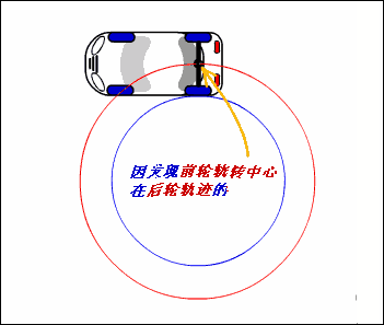 2、不难发现前轮轨迹的半径大于后轮轨迹的半径,因为汽车的旋转中心在后桥的中央,倒车时运动轨迹同样如此。