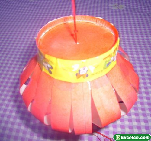7、用剩的纸杯剪成条捆成一束做灯笼的穗儿,染成红色后串好,用一根一次性筷子穿好,一个灯笼做好了。