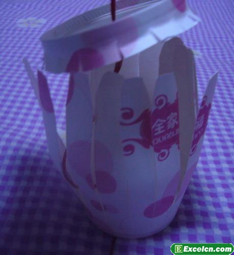 4、用红线贯穿杯子和杯盖. 在杯盖的每一片上都贴上一块双面胶, 把杯子和杯盖粘在一起;
