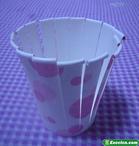 1、用剪刀把一次性纸杯均匀地剪成一条条;