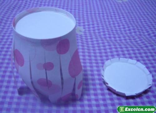 3、再用一个纸杯,把底部剪下来并剪开与刚才的纸条等份,象个杯盖;